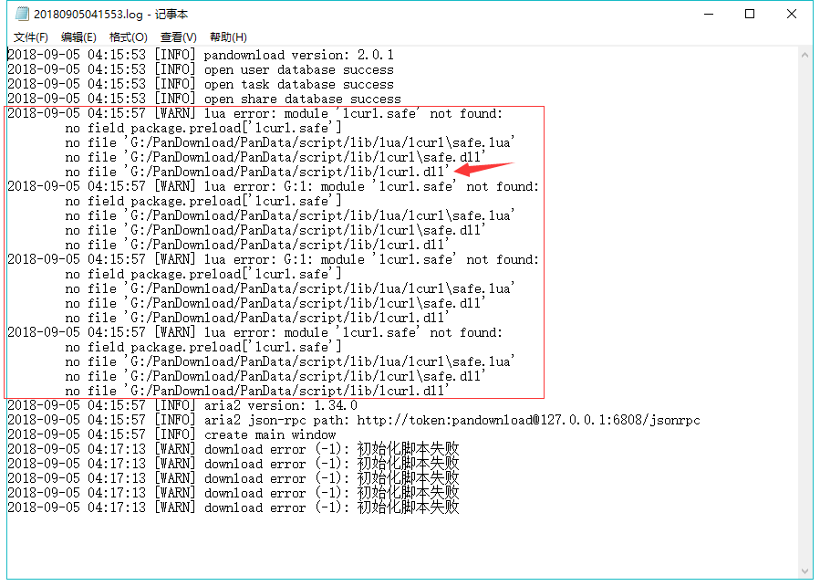 ②从日志可以看到错误原因是 PanData/script/lib/lcurl.dll 这个文件找不到